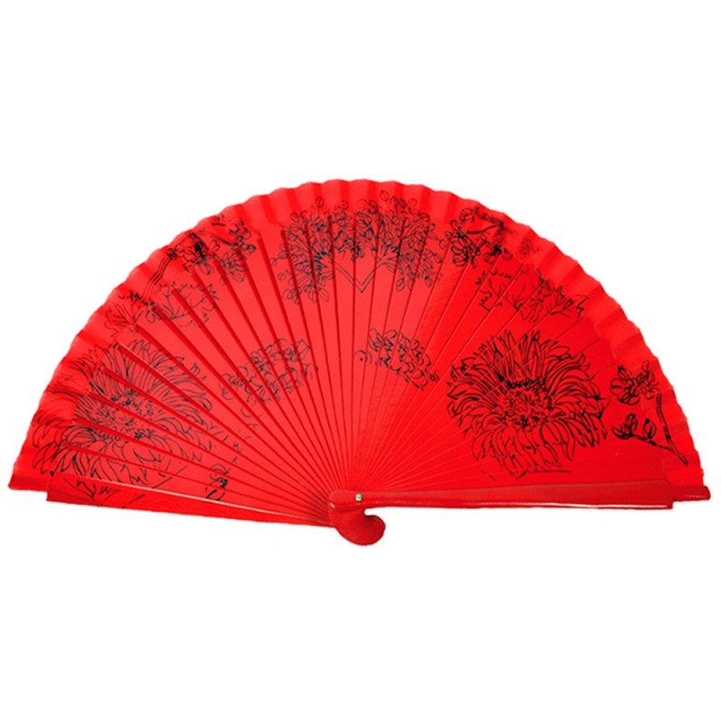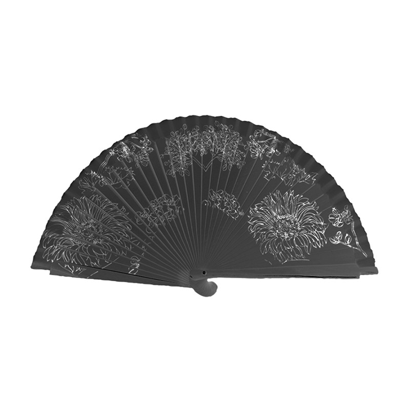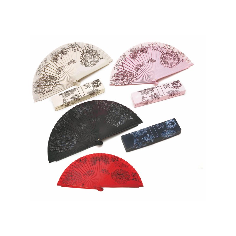Abanico fabricado en madera con diseños florales presentado en una caja a juego con el abanico.