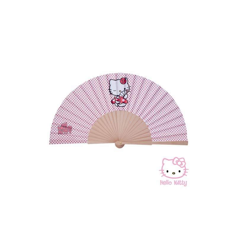 Abanico de Hello Kitty con varillas en madera natural y original diseño en tela con gatito de la marca. Presentado en caja individual decorada.