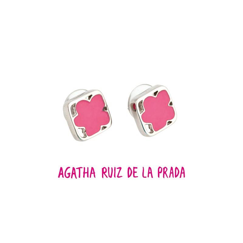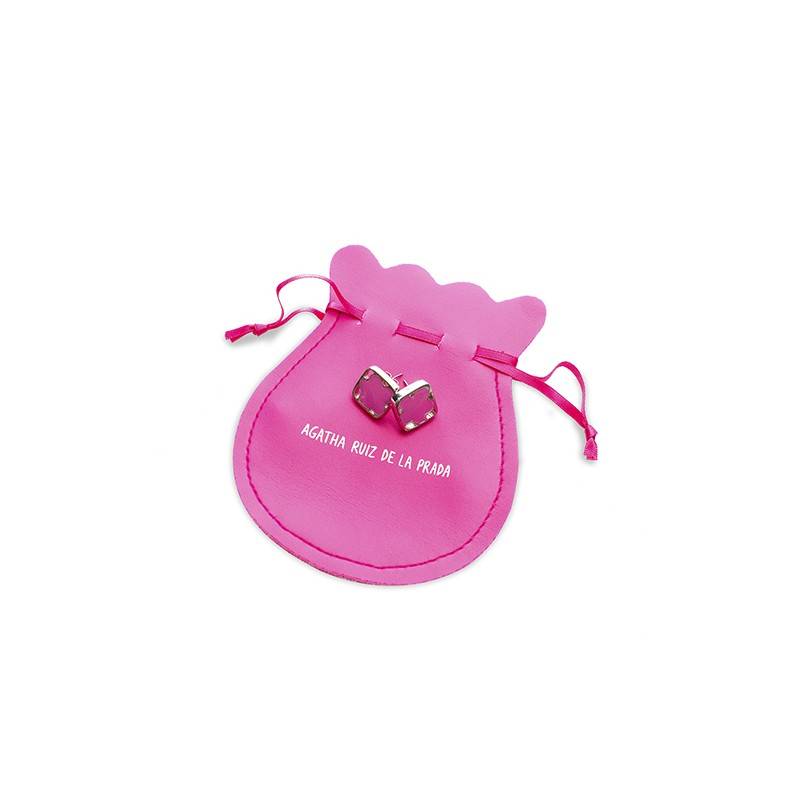 Pendientes de Ágatha Ruiz de la Prada en metal lacado con diseño de la marca esmaltado en color fucsia. Presentados en bolsita individual.