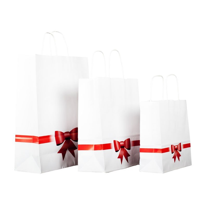 Bolsa de papel automático estucado blanco. Disponible en tres tamaños S-22x23x9, M-25x31x11, L-32x40x12 cm. Impresa con un llamativo lazo rojo ideal para regalos. Asa de papel rizado o retorcido.