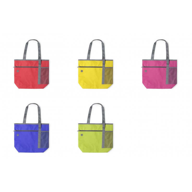 Bolsa en resistente poliéster 600D en original diseño bicolor de vivos tonos. Con bolsillo exterior de redecilla, asas largas para hombro, salida de auriculares y fuelle. Resistencia hasta 7kg de peso.
