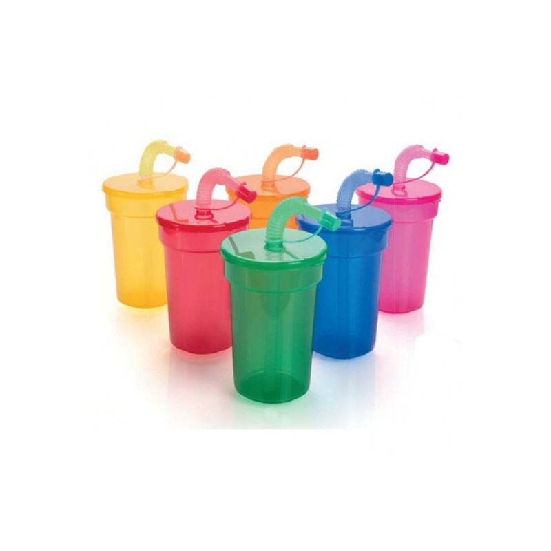 Vaso de PP de 400ml de capacidad con cuerpo transparente en variada gama de vivos colores. Con pajita flexible a juego.