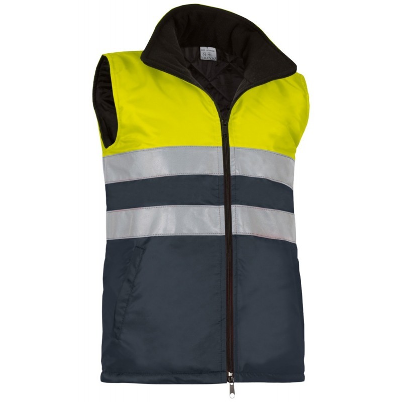 HIGHWAY. Chaleco confeccionado en tejido Oxford con recubrimiento de poliuretano, relleno acolchado y forro interior a contraste. Cuello alto con interior en tejido polar y cremallera frontal entera. Dos bolsillos delanteros con cremallera y un bolsillo interior en pecho izquierdo, también con cremallera. Incluye dos bandas de material retrorreflectante cosidas en el contorno de la prenda, por debajo del pecho. Disponible en un amplio colorido. Especialmente indicado para trabajos a la intemperie en climas fríos.