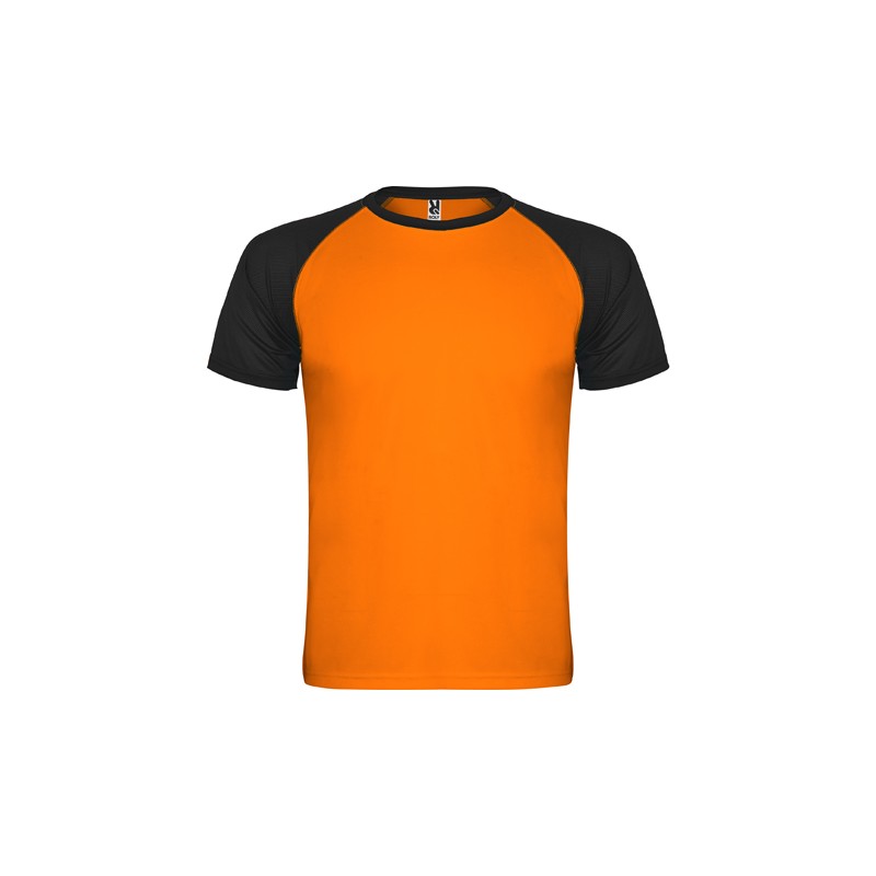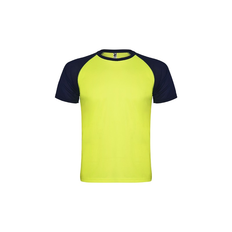 Camiseta deportiva de manga corta estilo ranglan en contraste. Cuello redondo en contraste con cubrecosturas de refuerzo.