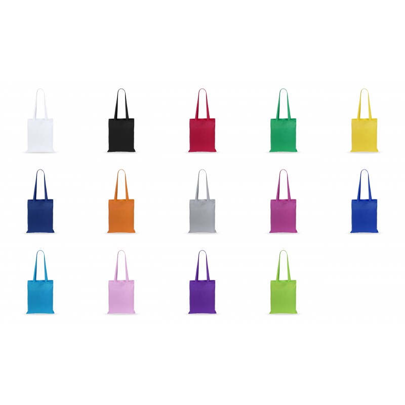 Bolsa de alta calidad en algodón de 140g/m2. Disponible en variada gama de colores, con asas largas reforzadas de 70cm. Resistencia hasta 10kg de peso.