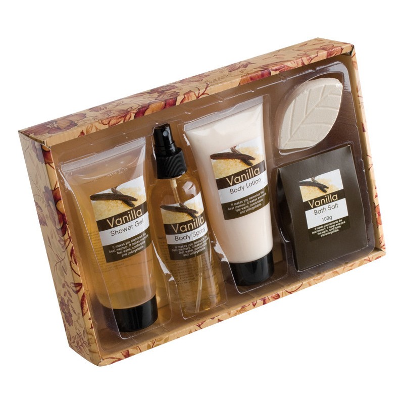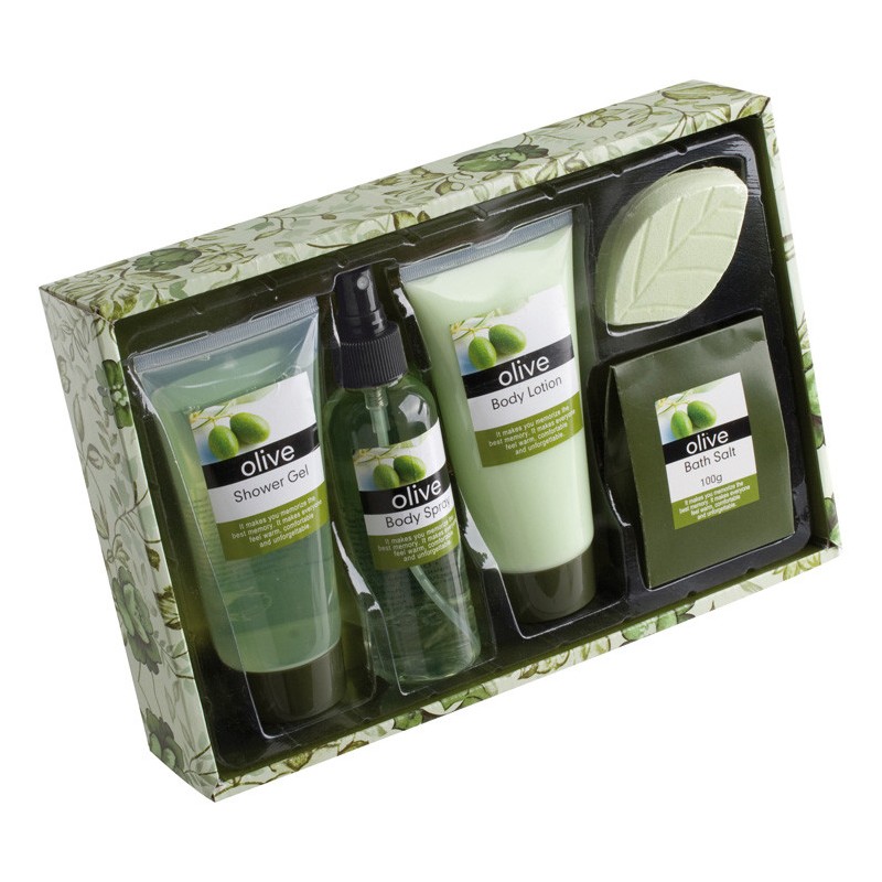 Cada uno a su gusto. Elija entre la papaya exótica, suave aceite de oliva, y vainilla suave. El juego incluye el gel de ducha, el spray corporal, la loción para el cuerpo y la sal de baño en pastilla y caja.