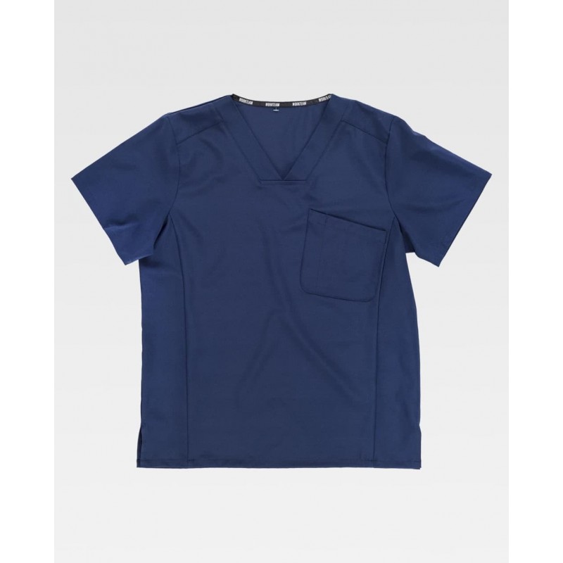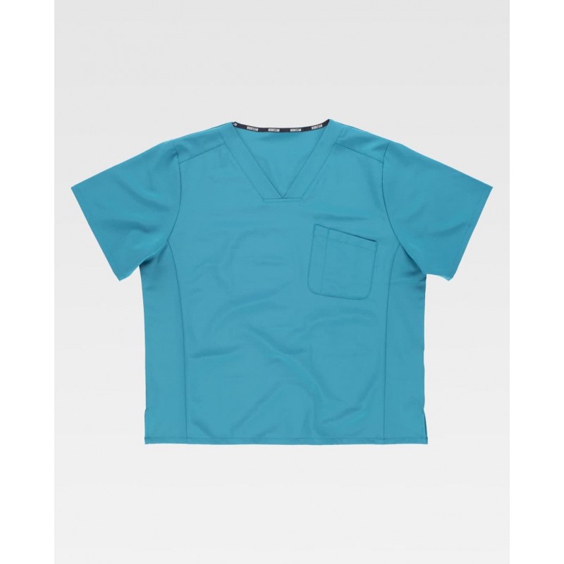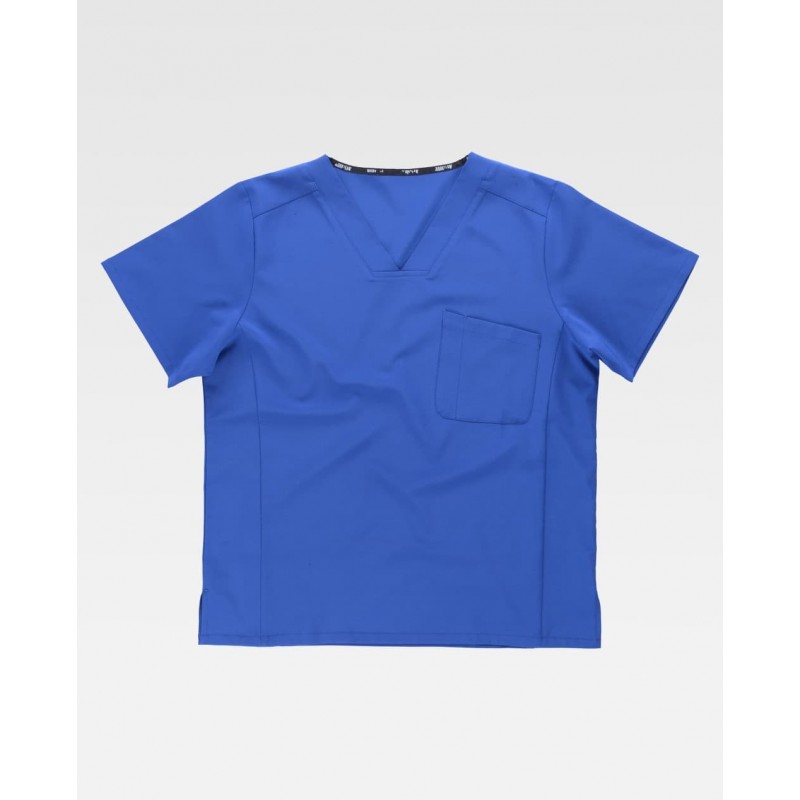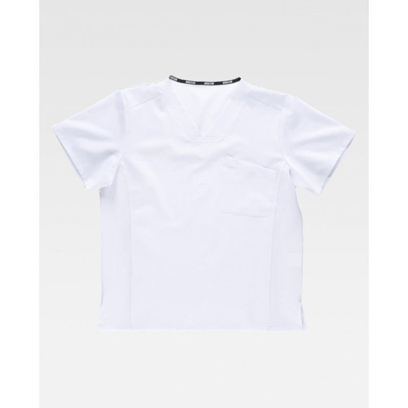 Casaca unisex de manga corta con tejido elástico. Cuello a pico. Un bolsillo en pecho de plastón. Un bolsillo para bolígrafos. Aberturas en los costados. 4 colores disponibles.
