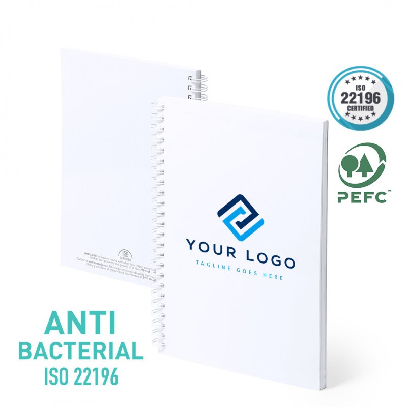 Libreta tamaño A5 con tapas antibacterianas flexibles de cartón laminado. En elegante acabado blanco mate, con anillas a juego. Cubiertas antibacterianas fabricadas con iones de plata (tecnología nano silver) que inhiben y previenen el crecimiento de al menos el 99% de las bacterias. Incluye 80 hojas de papel lisas en color blanco, calidad 80g/m2. Certificación PEFC disponible.