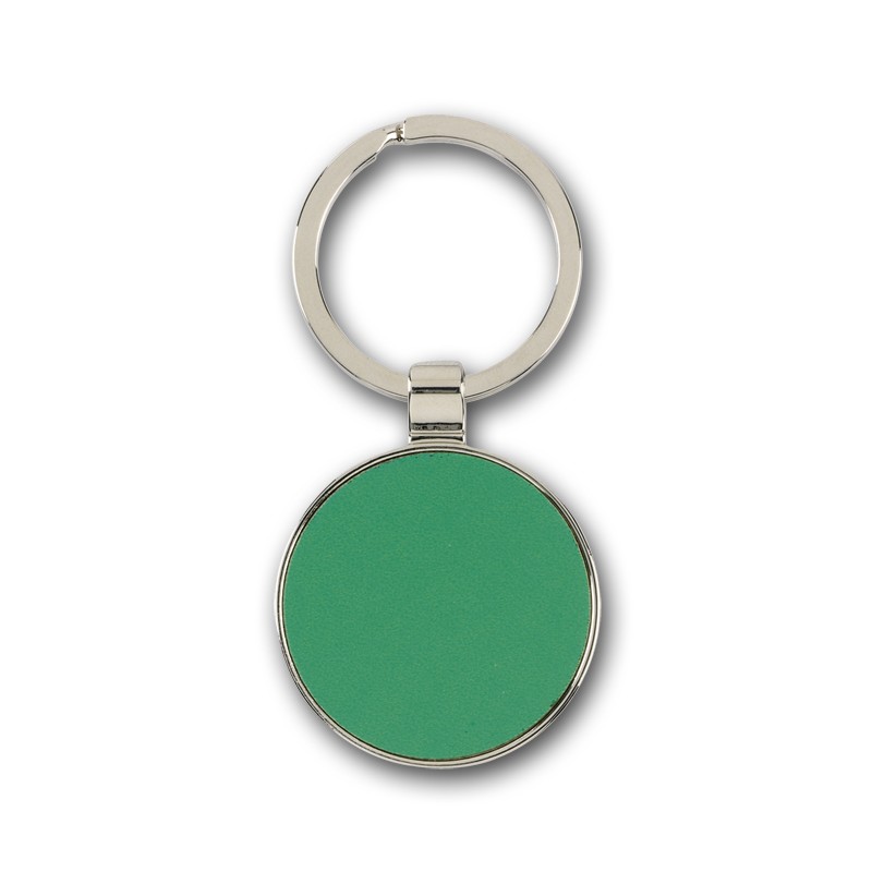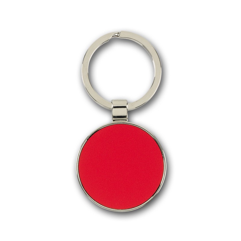 LLAVERO REDONDO METAL/POLIPIEL EN 4 COLORES, ROJO, NEGRO, AZUL O VERDE POR UNA CARA Y ACERO INOXIDABLE NEGRO POR LA OTRA.