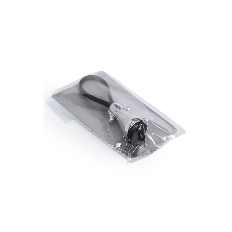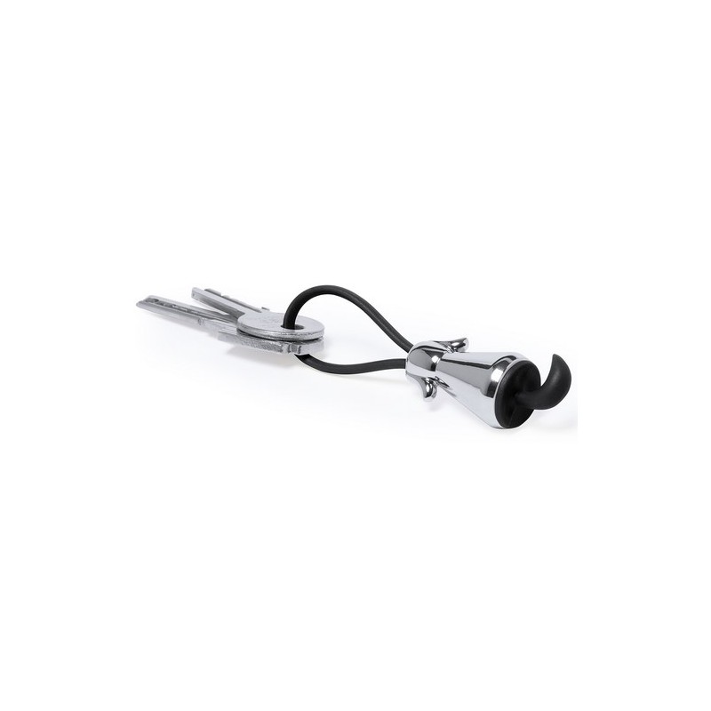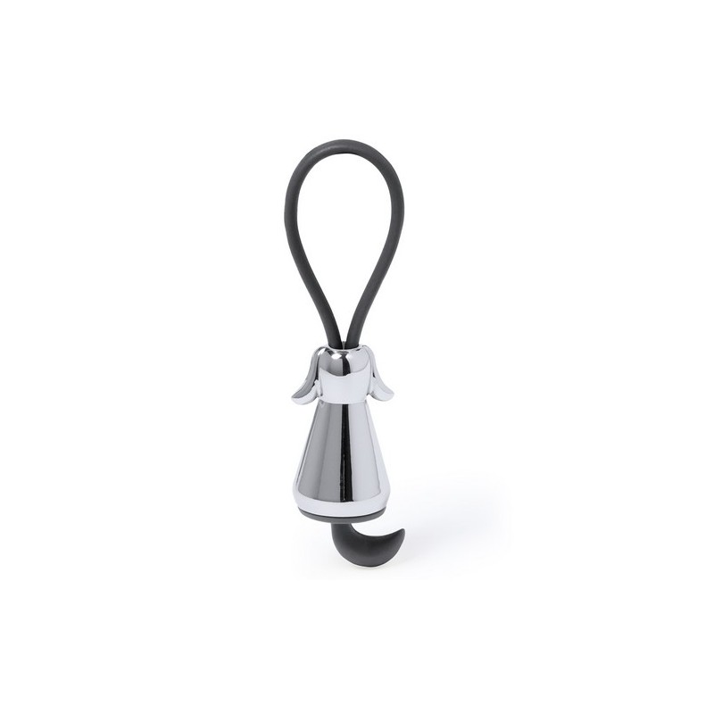 Llavero metálico de acabado brillante en original diseño minimalista de perro. Con cinta en resistente silicona de color negro.