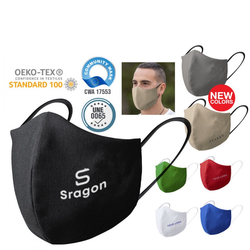 Mascarilla higiénica reutilizable. Fabricada en algodón y poliéster de doble capa, con costura frontal ergonómica para un cómodo ajuste y confortables cintas elásticas para las orejas en tejido hipoalergénico, con certificación OEKO-TEX Clase I. Disponible en variada gama de colores.