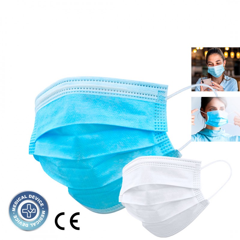 Mascarilla quirúrgica IIR, para uso médico y personal. Fabricación de 3 capas y acabado termosellado, incluyendo bandas elásticas de fijación en blanco y pinza adaptable en nariz para un firme ajuste. Disponible en acabados blanco y azul.