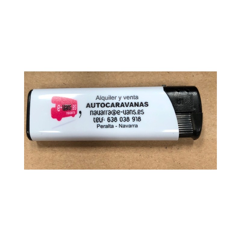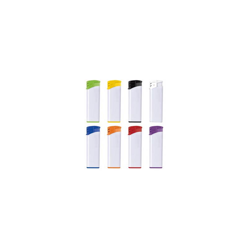 Encendedor electrónico recargable, con cuerpo blanco y terminaciones en distintos colores. Negro, rojo, azul, verde, naranja, violeta, blanco ó amarillo.