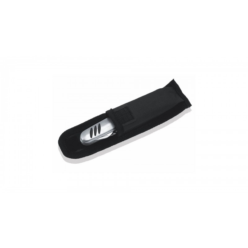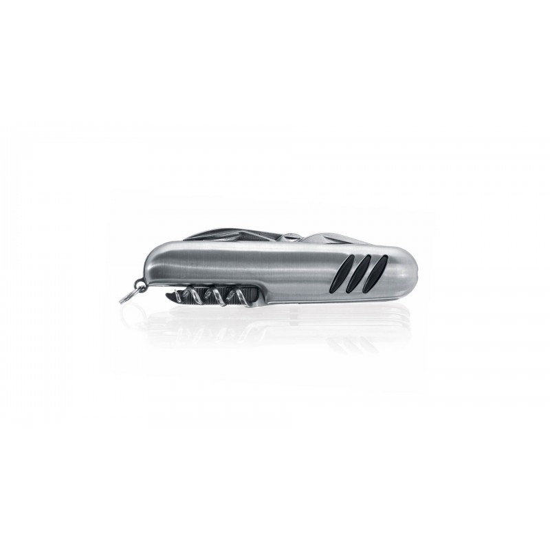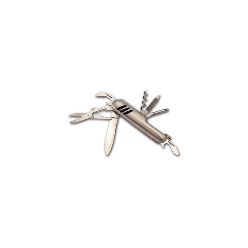 Navaja multiusos de acero inox de 10 funciones con empuñadura antideslizante. Incluye navaja, abridores, destornillador, lima, tijeras y anilla para llavero. Presentada en caja individual.