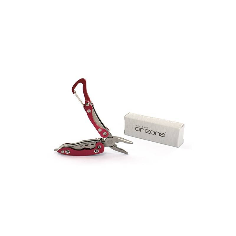 Multiherramienta de orizons con accesorios de acero inox de 6 funciones y mango de aluminio en vivos colores. Con alicates, navaja, abrelatas con destornillador de punta plana con función abrebotellas, destronillador de punta de estrella y mosquetón de acople. Presentada en atractiva caja de diseño con logotipo de la marca.