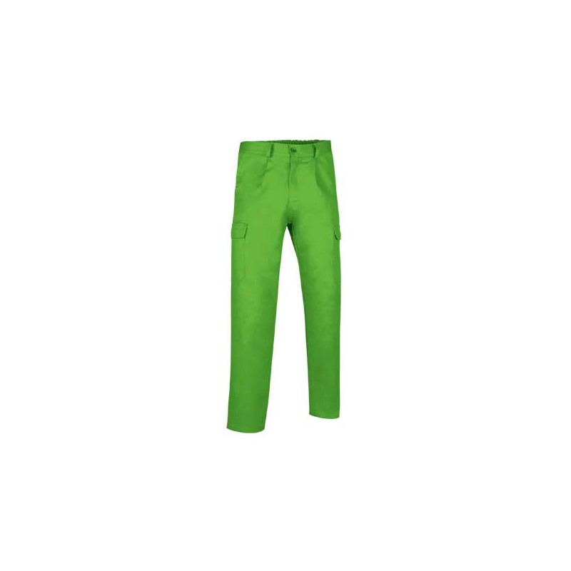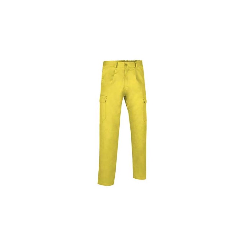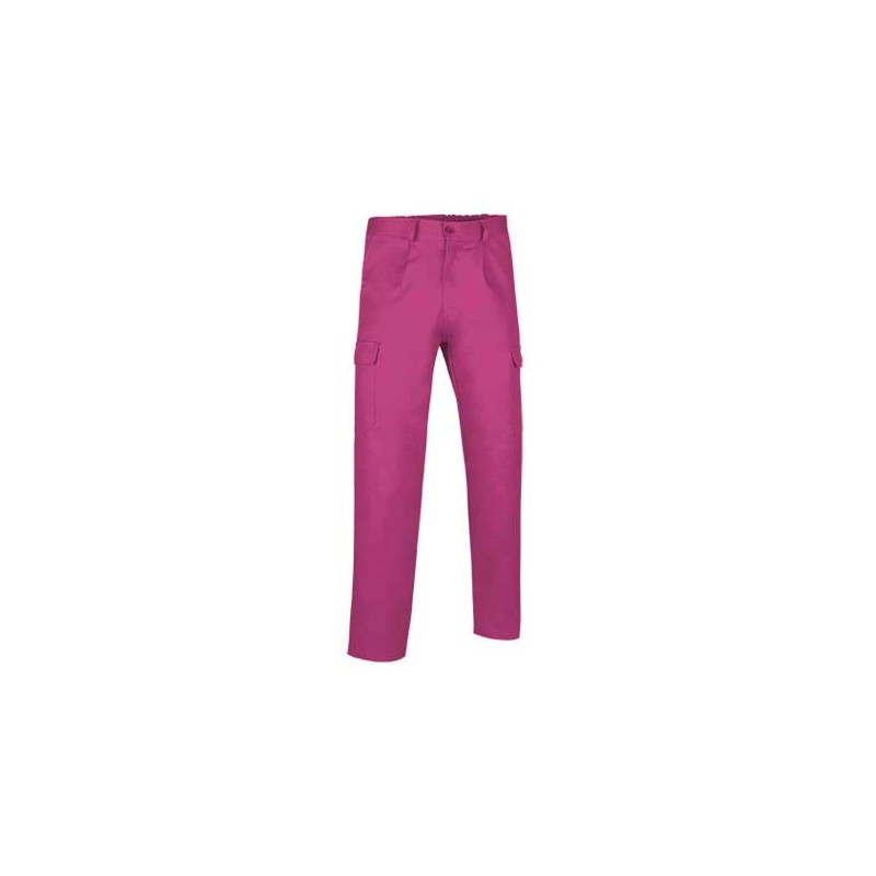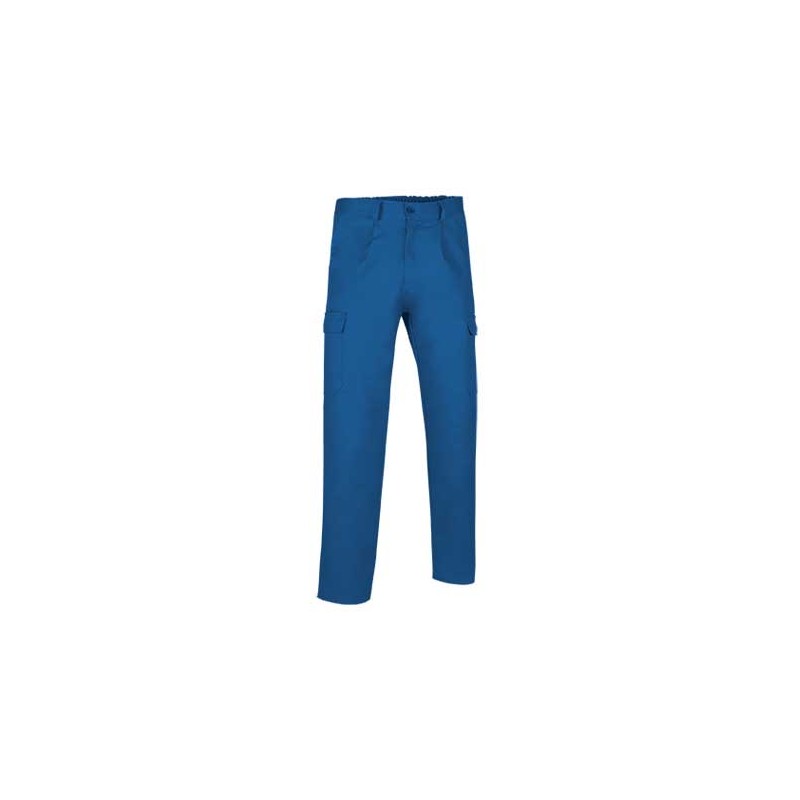 Pantalón largo multibolsillos con pinzas, confeccionado en tejido de sarga resistente y duradera. Cintura con elástico interior en la zona trasera para un mejor ajuste. Dos bolsillos oblicuos en la cadera y dos bolsillos grandes de parche con tapa y cierre de velcro en los laterales de ambas perneras. Bolsillo trasero de parche en lado derecho. Cierre central con cremallera y botón. Disponible en un amplio surtido de colores.