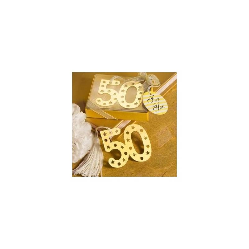 Elegante punto de libro 50 aniversario Presentado en una cajita de regalo. Decorado con un lazo blanco de organza. Medidas: 7.5 x 9cm