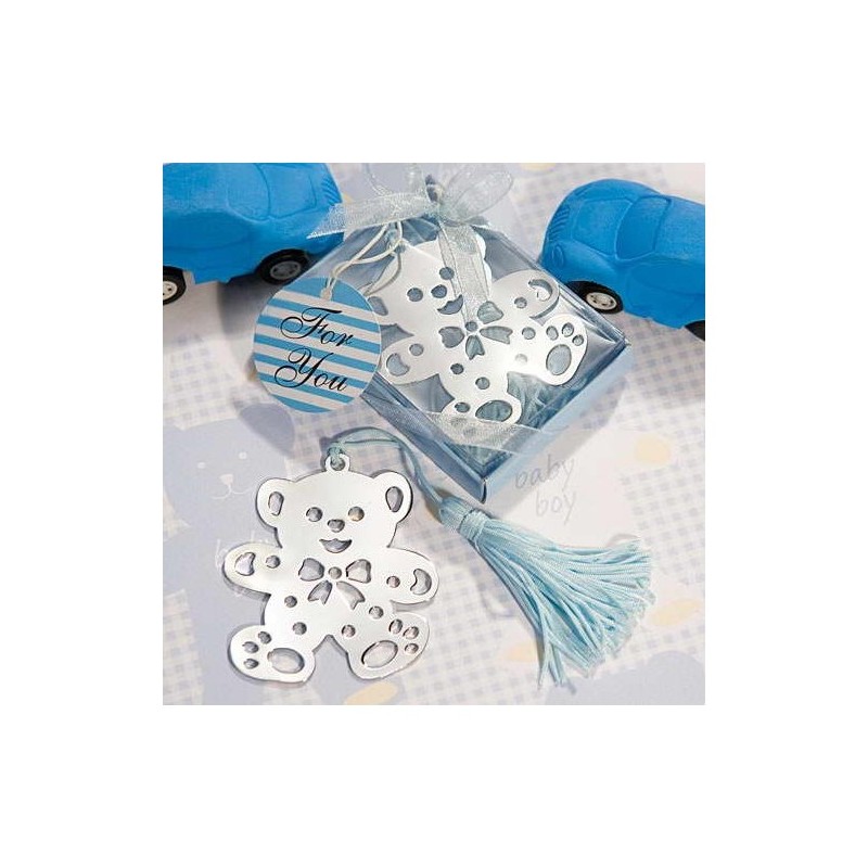 Simpático Punto de Libro de osito con borla Azul, en cajita individual de regalo.