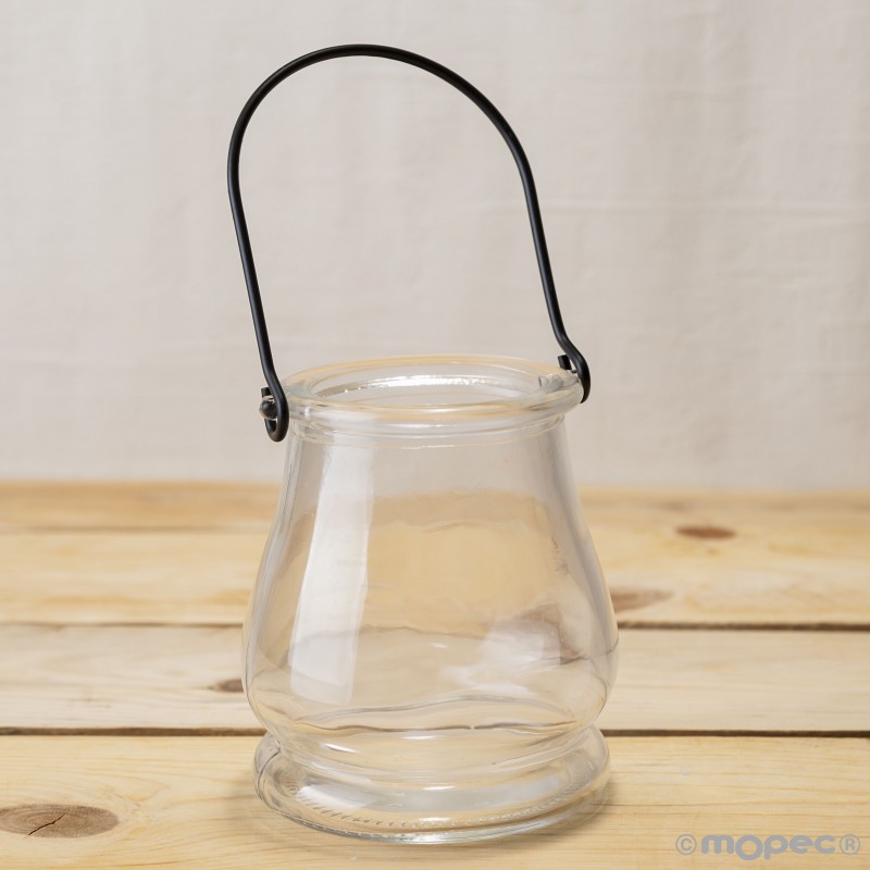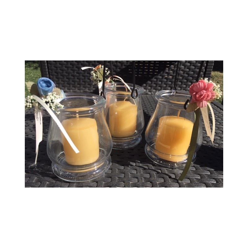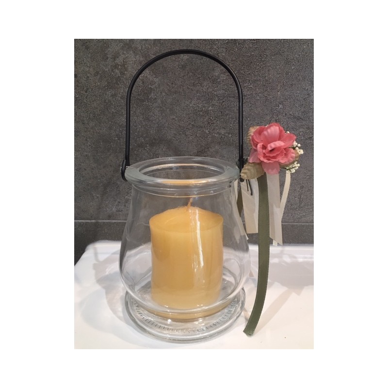Bonito portavelas de cristal de aprox. 8x10cm. con asa de metal que le da un estilo de última tendencia. Incluye bonita vela de 6,2cm. de alto y 5cm. de diámetro y bouquet de flores, ideal para regalar en eventos como bodas y Comuniones. Son perfectos para decoraciones tanto de interiores como del exterior. La gran versatilidad que tiene, hace que sea uno de los productos más recurrentes para ofrecer a los invitados a un evento.
