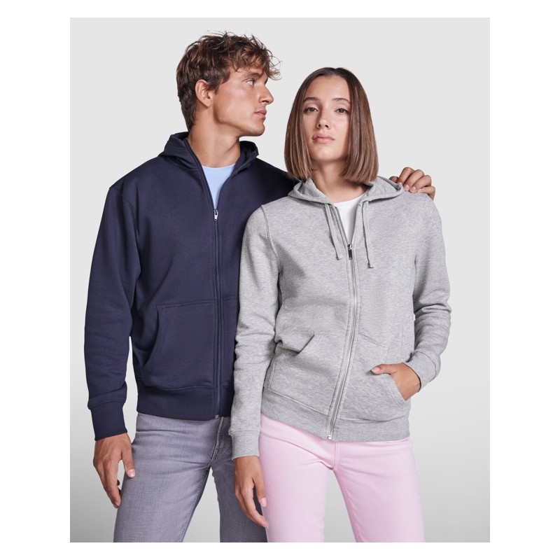 Chaqueta con capucha, cuello alto y cremallera completa. Detalle canalé en contorno capucha y bolsillos. Bolsillo estilo canguro. Punto canalé 2x2 en puños y cintura.