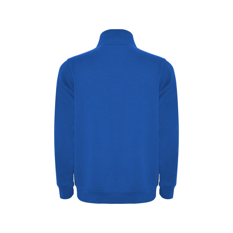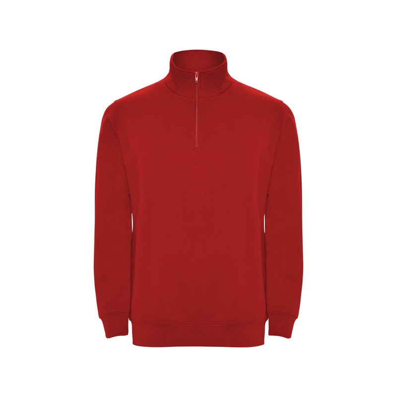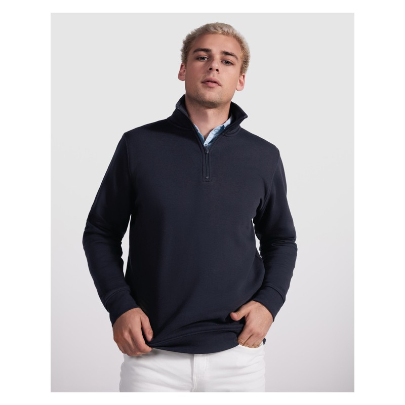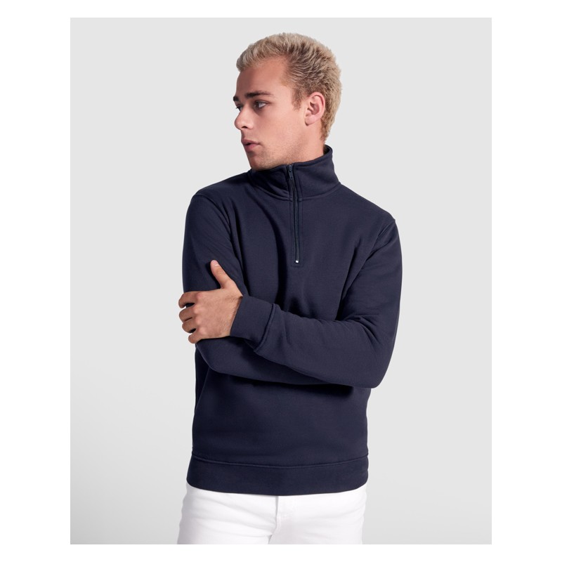 Sudadera con media cremallera a tono y cuello alto. Vista interior del cuello en el mismo tono. Cubrecosturas reforzado en el interior del cuello. Punto canalé 1x1 en puños y cintura.