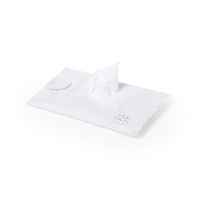 Pack de toallitas húmedas higienizantes hidroalcohólicas para limpieza de manos y superficies de uso frecuente (smartphones, barras del carrito de la compra, teclados…). Presentadas en bolsa dispensador de 10 unidades, con amplia superficie de marcaje.